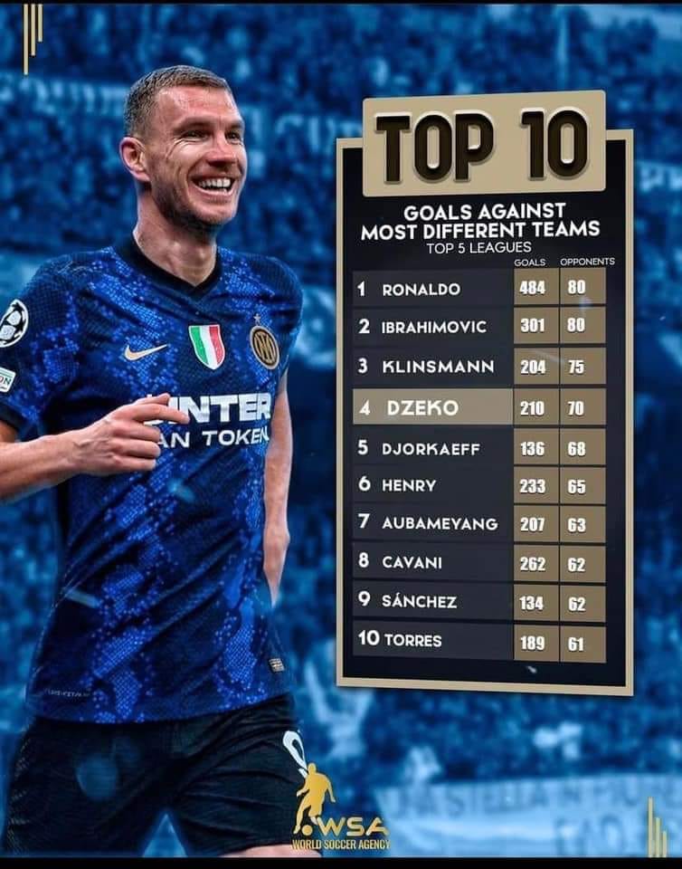 Na prvom mjestu su Cristiano Ronaldo i Zlatan Ibrahimović. Ovaj dvojac je ukupno postizao golove protiv 80 različitih ekipa.