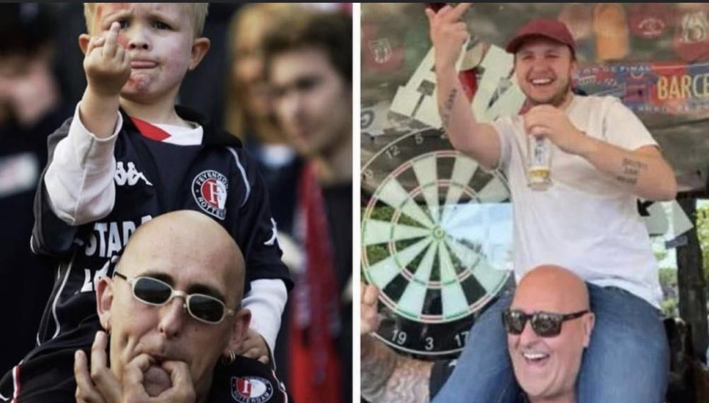 Navijač Feyenoorda koji je stekao svjetsku slavu kako kao petogodišnjak pokazuje srednji prst je ponovio čuvenu fotografiju nastalu prije 20 godina.
