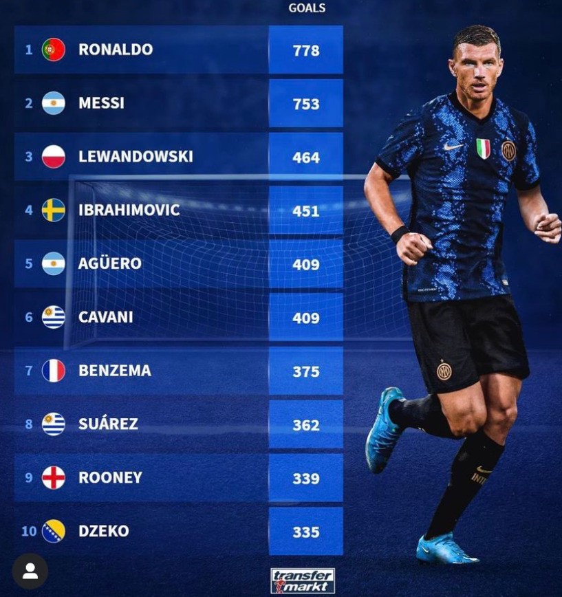 Naime, prema podacima stranice transfermarkt, Džeko se nalazi među deset najboljih strijelaca u Evropi, gledajući Lige petice.